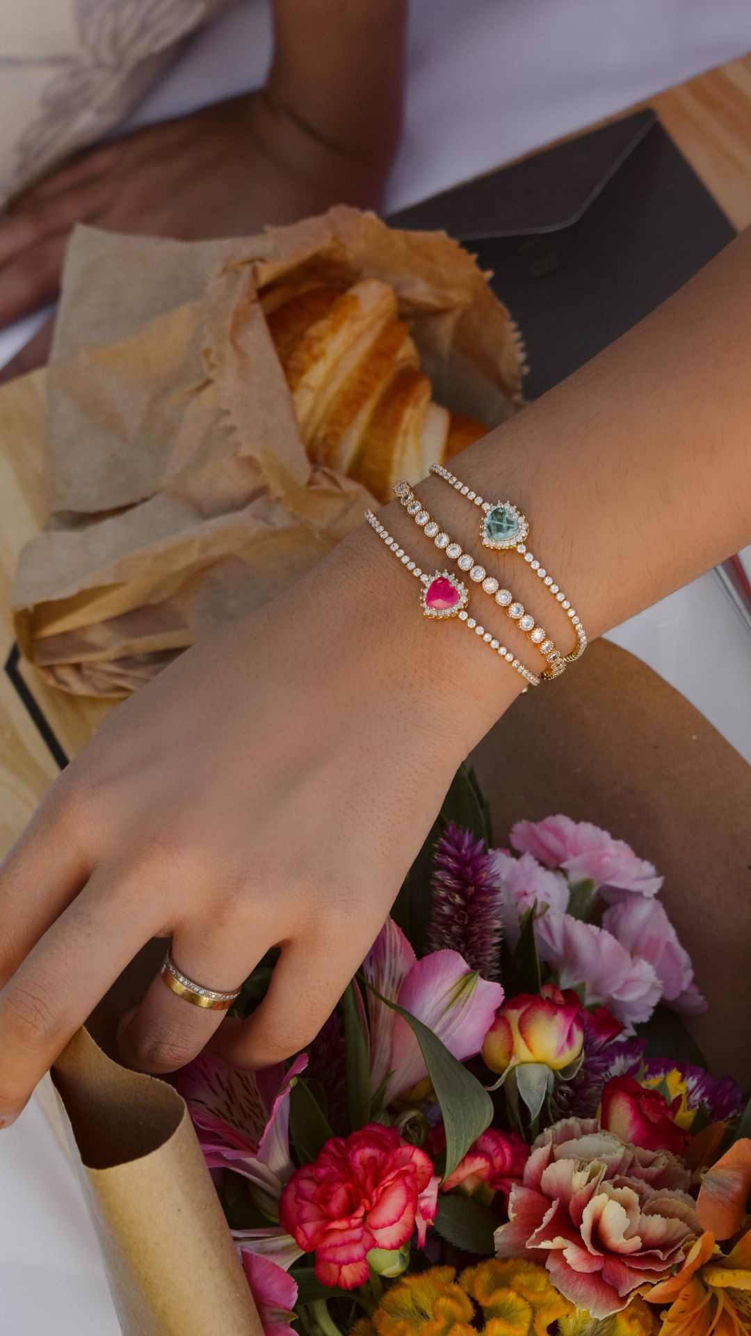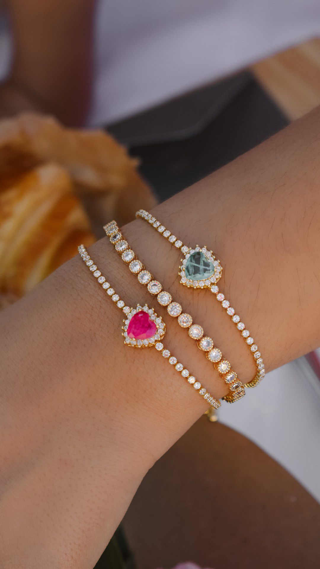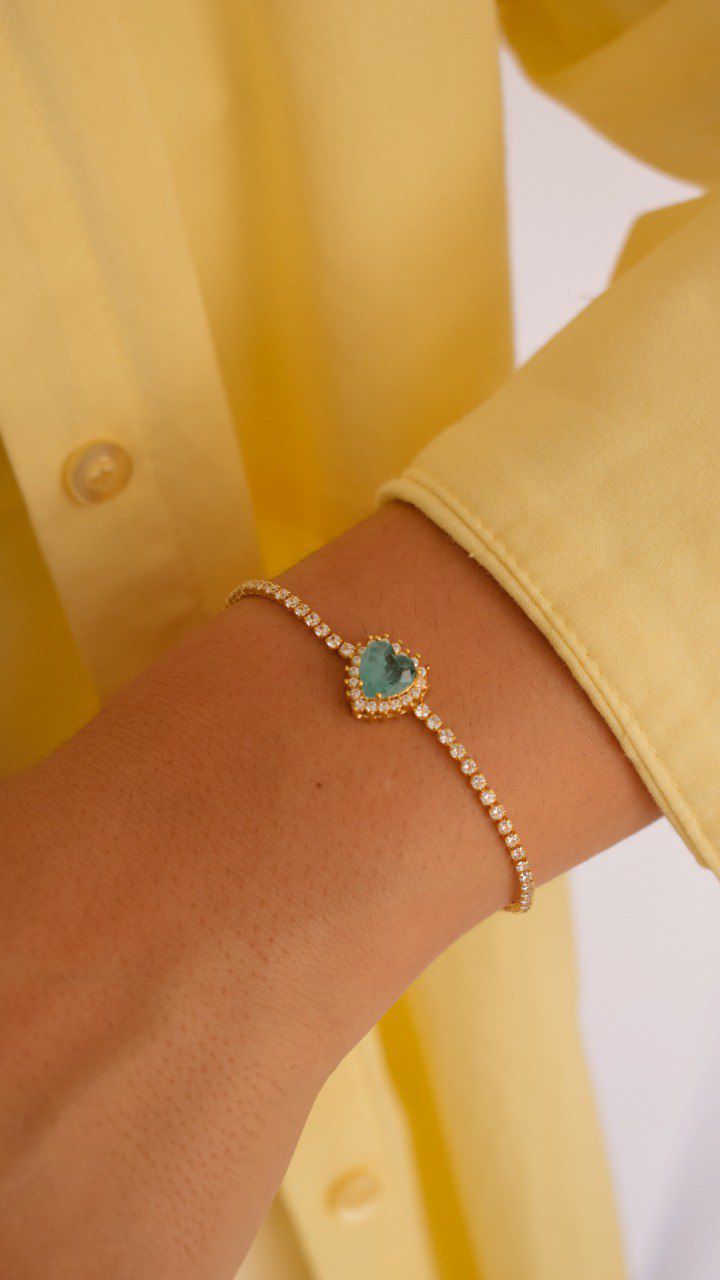 The Gold Pavé Bracelet with Green Heart Stone expresses emotion through shape and color. Its heart-shaped blue stone represents serenity, trust, and deep emotional connection. Surrounded by shimmering pavé-set micro zirconias, the golden structure adds refined sparkle and sophistication.