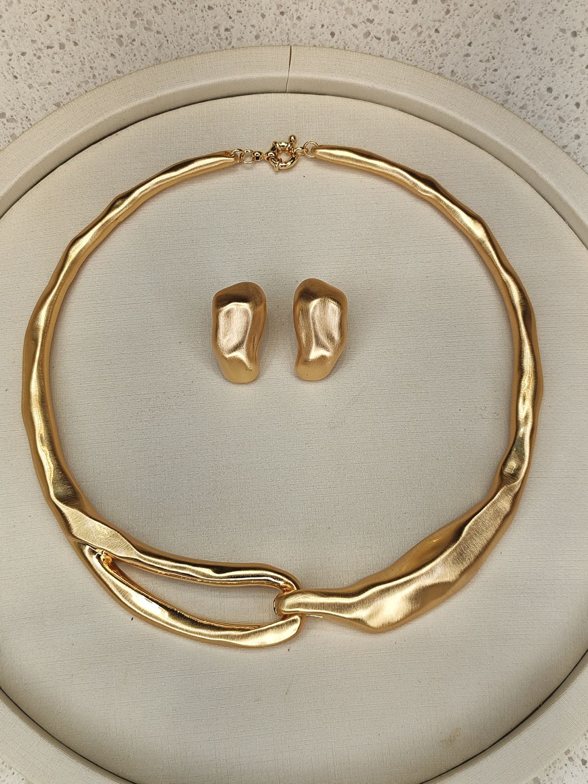 Hammered accents catch the light with subtle irregularity, adding depth and personality to the set. A bold yet refined choice for women who embrace distinctive, statement-making pieces.
