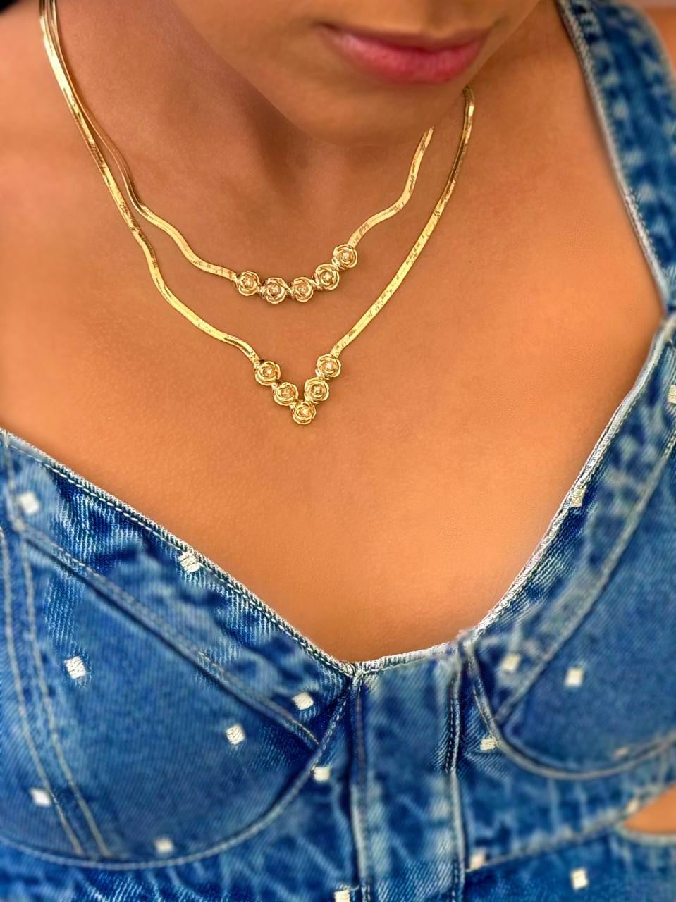 The V-Shaped Bar Necklace with 5 Central Roses brings a poetic and artistic touch to jewelry. With a structured V-shaped plate and five raised roses delicately aligned at the center, this piece radiates charm, originality, and feminine strength.